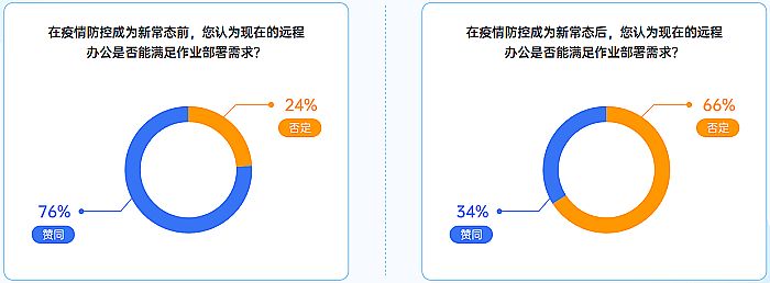 調(diào)研報(bào)告顯示,92.10%的IT管理者認(rèn)為遠(yuǎn)程辦公形態(tài)的變化主要集中在“部署實(shí)施環(huán)節(jié)”。此外,疫情常態(tài)化之前有76%的IT管理者認(rèn)為當(dāng)時(shí)的遠(yuǎn)程辦公方案已經(jīng)能夠滿足作業(yè)部署需求,但疫情常態(tài)化之后,這一數(shù)字降低至34%。