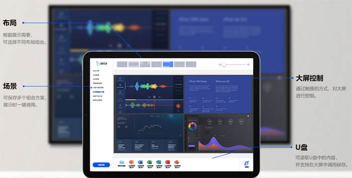DECS屏幕智能管理系統(tǒng)基于本地云架構(gòu)設(shè)計,整合多媒體、音視頻、環(huán)境控制等多種資源,打破場所中各個資源的聯(lián)通限制,能夠?qū)Υ笃溜@示控制系統(tǒng)、視頻處理系統(tǒng)、音頻處理系統(tǒng)、環(huán)境控制系統(tǒng)進行統(tǒng)一管理,簡化系統(tǒng)架構(gòu)、降低部署和運維難度。DECS定制化的交互頁面和精細化的資源控制,解決了屏幕集中控制的難題,通過一個PAD即可控制全展廳、多會議室等多個場所,實現(xiàn)All in one全資源統(tǒng)一管控。