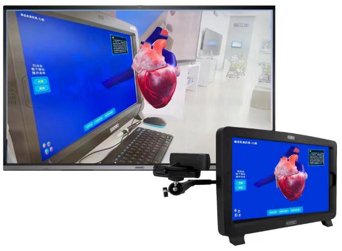 目前,基于該架構(gòu),希沃提供3D/VR教學(xué)方案和AR教學(xué)方案。3D/VR教學(xué)方案還原各類實(shí)訓(xùn)場景,具有虛實(shí)結(jié)合、體驗(yàn)逼真、交互多樣的特點(diǎn),教師操作桌面VR交互一體機(jī),學(xué)生佩戴3D眼鏡在座位上觀看黑板,即可看到更逼真的教學(xué)畫面。