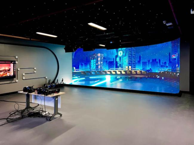 中國傳媒大學(xué)融媒體中心作為全國四個重點(diǎn)媒體實(shí)驗(yàn)室之一,升級改造后的它更加富有“科技感”。該演播室是基于擴(kuò)展現(xiàn)實(shí)技術(shù)全新升級的演播室,可以將現(xiàn)實(shí)中的人物和道具放置于由LED屏幕構(gòu)成的場景中,實(shí)現(xiàn)虛擬和現(xiàn)實(shí)的融合呈現(xiàn)。演播區(qū)采用了以弧形大屏搭配地磚屏的方案,以充分利用現(xiàn)有空間,滿足多角度取景拍攝需求,完成小規(guī)模的電影級超高清虛擬影像創(chuàng)作。