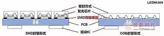 COB封裝工藝的LED顯示屏,很容易做到這點。如果我們有機會把COB的LED顯示屏與SMD的LED顯示屏放在一起,可以很容易發(fā)現(xiàn):COB的LED顯示屏發(fā)光柔和像面光源,SMD的LED顯示屏則明顯感覺到發(fā)光顆粒是一個個獨立的發(fā)光點。從圖3可知道,COB封裝的密封方式和SMD的密封方式有顯著不同。COB封裝的密封方式是很多個發(fā)光像素在一起的整體發(fā)光面。SMD封裝的密封方式是單個發(fā)光像素,是一個個的獨立發(fā)光點。