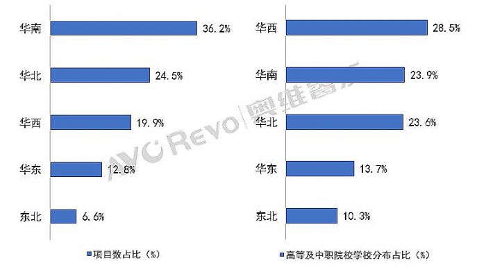 注:左圖高等及中職院校項(xiàng)目數(shù)來自于2022年8-10月時(shí)間范圍,右圖數(shù)據(jù)根據(jù)國(guó)家教育局公布數(shù)據(jù)統(tǒng)計(jì)