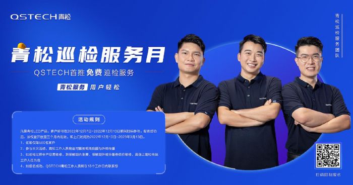 凡是QSTECH青松LED產(chǎn)品,即可在2022年12月7日-2022年12月13日期間掃碼或點(diǎn)擊“閱讀原文”報(bào)名。報(bào)名成功的客戶享有一次產(chǎn)品巡檢權(quán)益,因疫情不確定性影響,該權(quán)益開放至三個(gè)月內(nèi)有效,即上門時(shí)間截止至2023年3月13日。