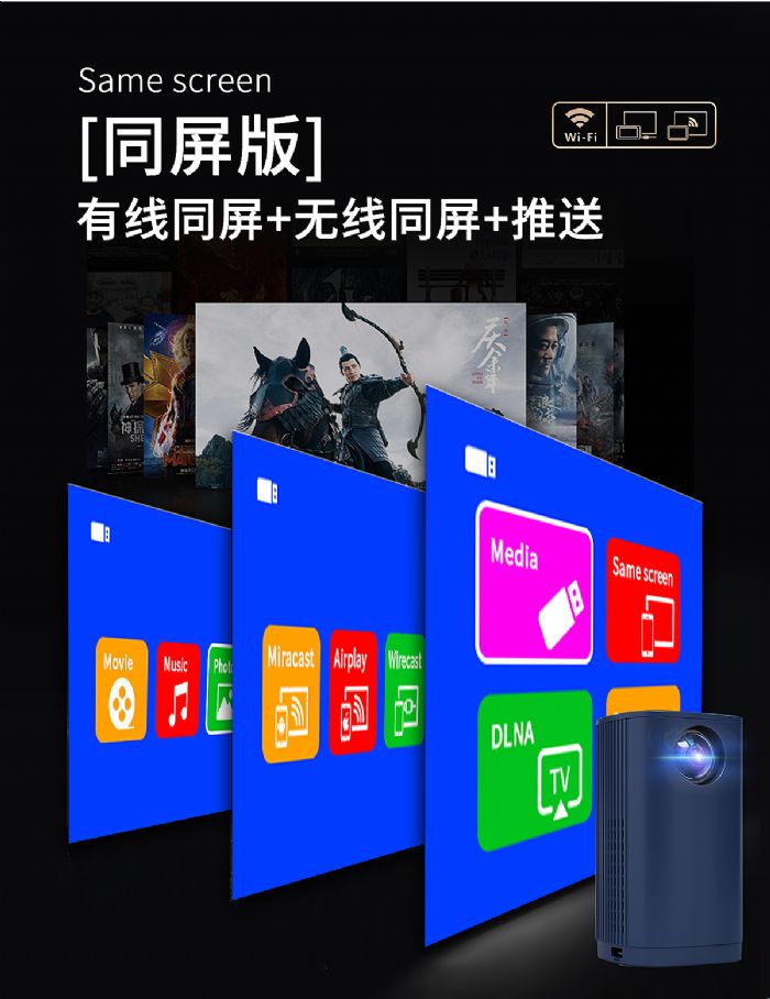 同屏版(支持有線同屏、無線同屏、DLNA)/立式設(shè)計/短焦鏡頭/LED光源/小體積/雙風(fēng)扇散熱/多媒體解碼/內(nèi)置音箱