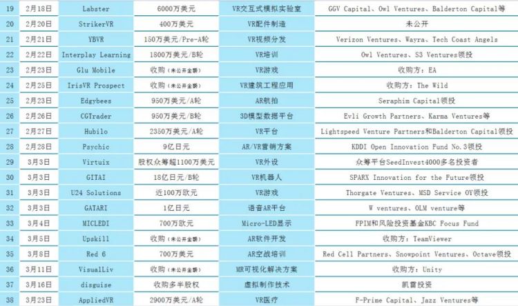 本月融資并購多為平臺/軟件方面。國外方面,VR交互式模擬實驗Labster完成了6000萬美元的巨額融資。國內(nèi)方面,有四筆千萬級人民幣以上的硬件/技術(shù)方向融資。