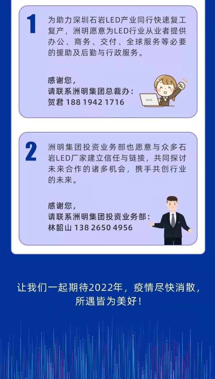 1、為助力深圳石巖LED產(chǎn)業(yè)同行快速?gòu)?fù)工復(fù)產(chǎn),洲明愿意為L(zhǎng)ED行業(yè)從業(yè)者提供辦公、商務(wù)、交付、全球服務(wù)等必要的援助及后勤與行政服務(wù)。