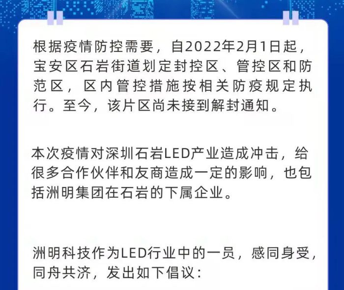 本次疫情對(duì)深圳石巖LED產(chǎn)業(yè)造成沖擊,給很多合作伙伴和友商造成一定的影響,也包括洲明集團(tuán)在石巖的下屬企業(yè)。