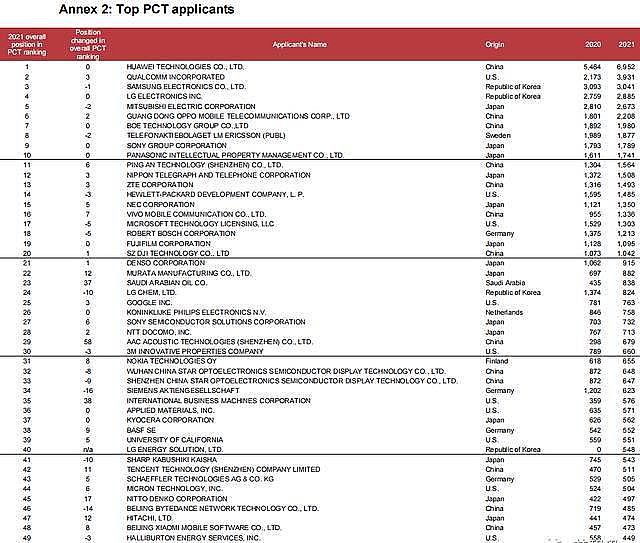 2021年全球PCT專利申請量排名:華為第一,OPPO、京東方進入前十