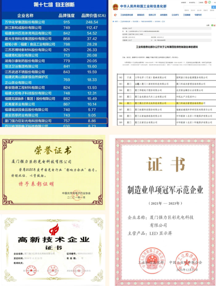 歷經(jīng)18年砥礪發(fā)展,強力巨彩已成為全球知名的LED顯示產(chǎn)品與解決方案供應(yīng)商,備受社會各界的認可。國家認定企業(yè)技術(shù)中心、高新技術(shù)企業(yè)、國家知識產(chǎn)權(quán)優(yōu)勢企業(yè)、國家重點新產(chǎn)品、中國品牌500強、國家級“制造業(yè)單項冠軍示范企業(yè)”等各種榮譽紛至沓來。