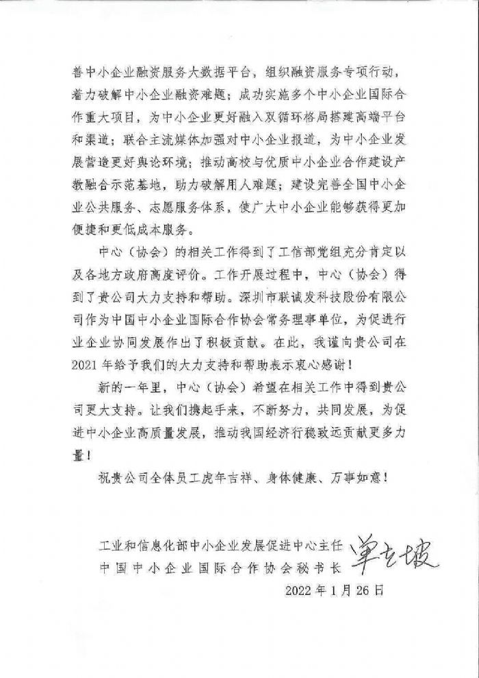 近日,聯(lián)誠發(fā)收到一封來自工業(yè)和信息化部中小企業(yè)發(fā)展促進(jìn)中心、中國中小企業(yè)國際合作協(xié)會(以下簡稱“協(xié)會”)的感謝信。信中,中心/協(xié)會對聯(lián)誠發(fā)為促進(jìn)中小企業(yè)協(xié)同發(fā)展作出的積極貢獻(xiàn)以及2021年度對中心/協(xié)會工作的支持與幫助進(jìn)行了感謝與贊揚(yáng)。