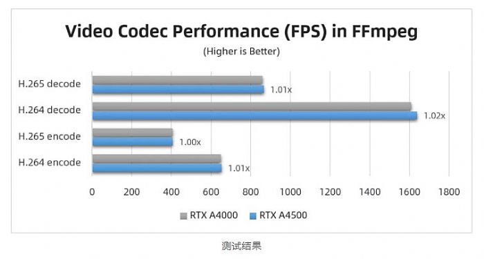 在編解碼測試中,由于兩者都是安培架構(gòu)的顯卡,所使用的編解碼芯片是一樣的,編解碼器的數(shù)量也相同,所以在編解碼性能上差距不大。從總的測試情況來RTX A4500的性能略高于RTX A4000,提高不多。