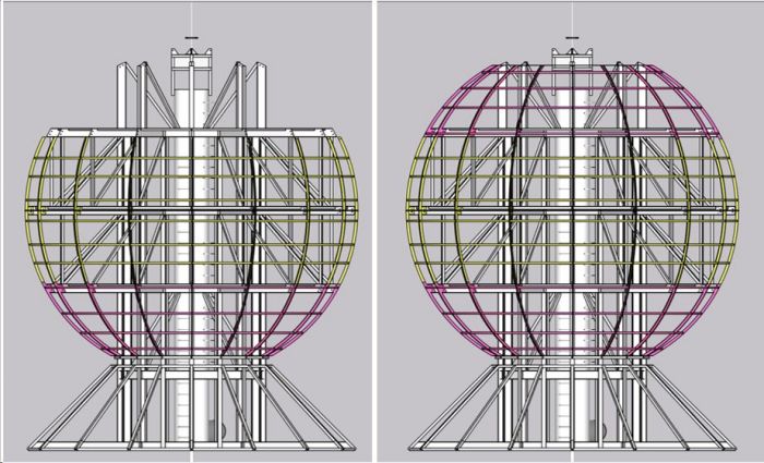 圍繞中部核心梁搭建主梁、副梁和副架,構筑成為錐形底座,用以支撐穩(wěn)固上方球體的鋼構龍骨和外部屏體。