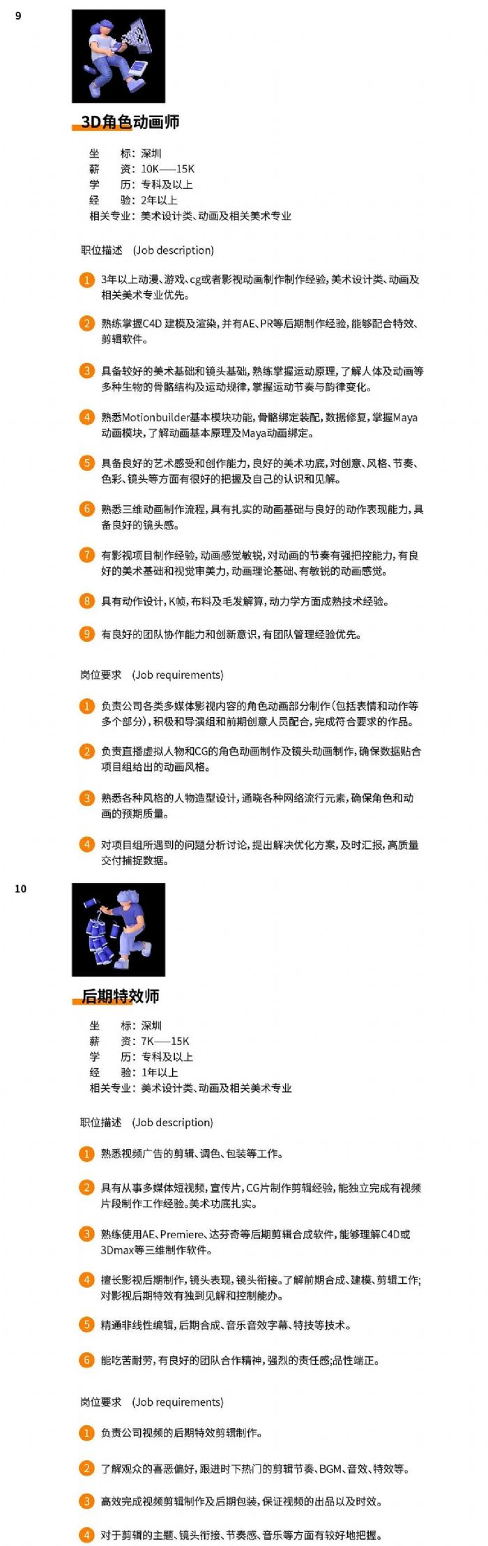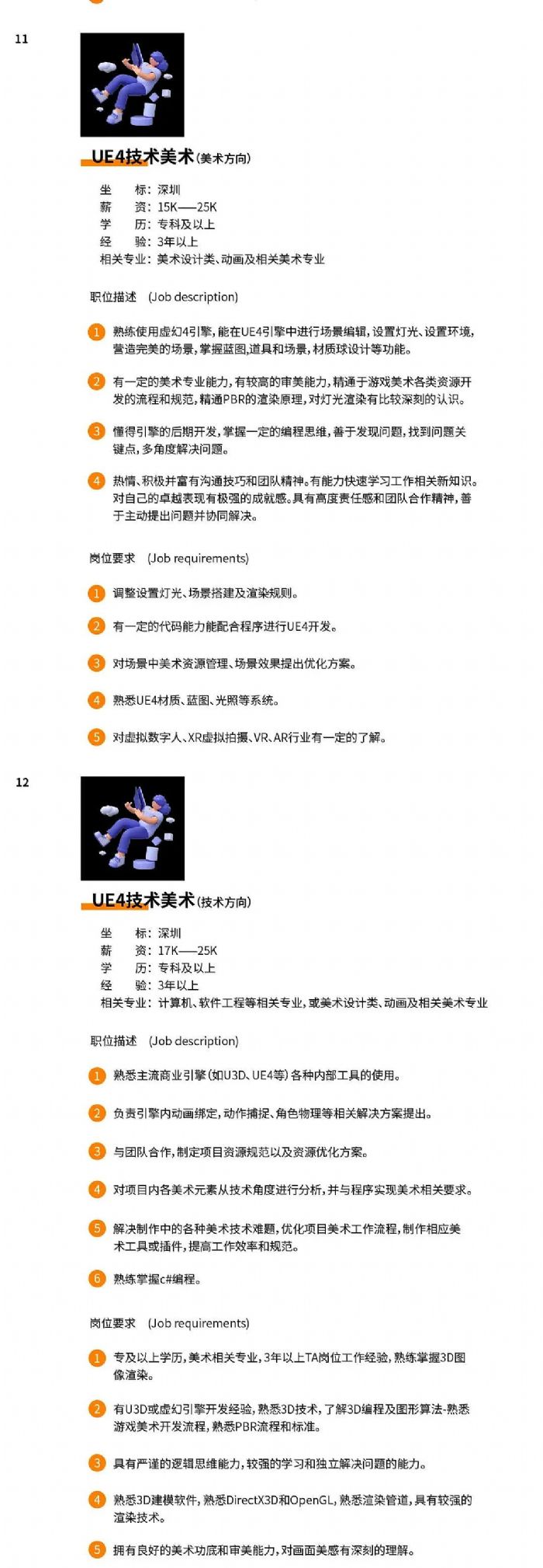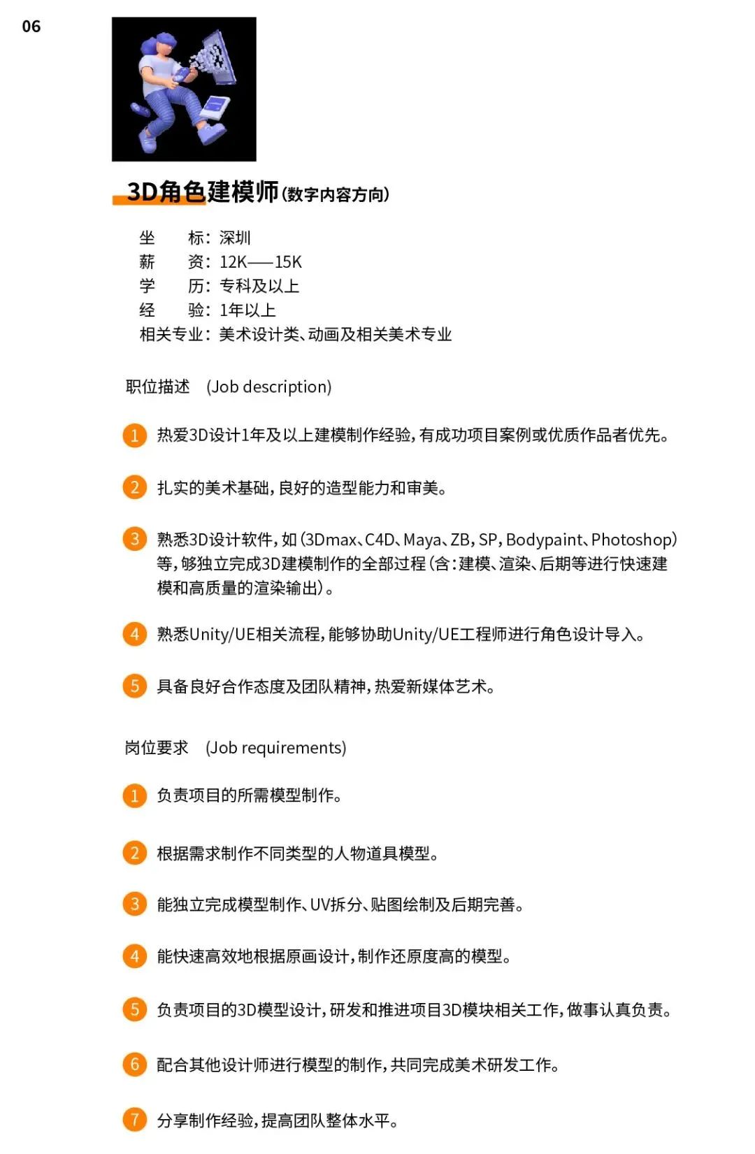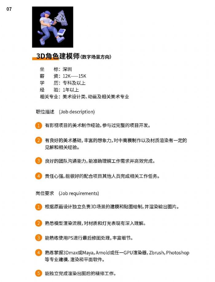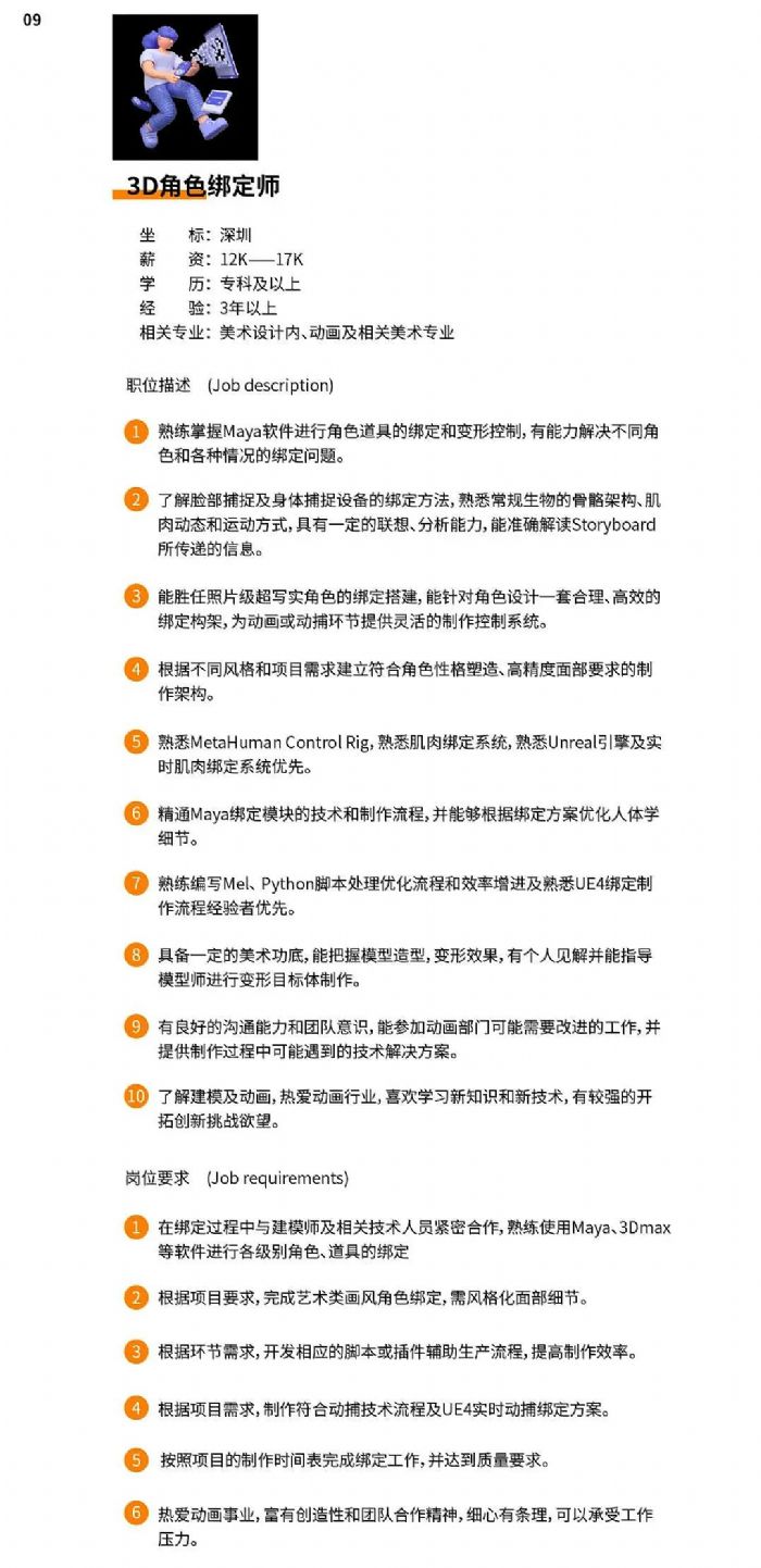 公司正處于業(yè)務(wù)拓展階段,需要更多的人才加入我們,F(xiàn)開放17個(gè)工作崗位:項(xiàng)目組長、視覺設(shè)計(jì)師、原畫設(shè)計(jì)師、3D角色建模師(數(shù)字內(nèi)容)、3D建模師(數(shù)字場景)、3D角色綁定師、后期特效師、UE4技術(shù)美術(shù)(美術(shù))、項(xiàng)目實(shí)施經(jīng)理各1人;創(chuàng)意策劃師、3D角色動(dòng)畫師、UE4技術(shù)美術(shù)(技術(shù))、技術(shù)支持工程師、人力資源各2人;3D角色建模師(數(shù)字人)、產(chǎn)品經(jīng)理、Unity開發(fā)工程師各3人。
