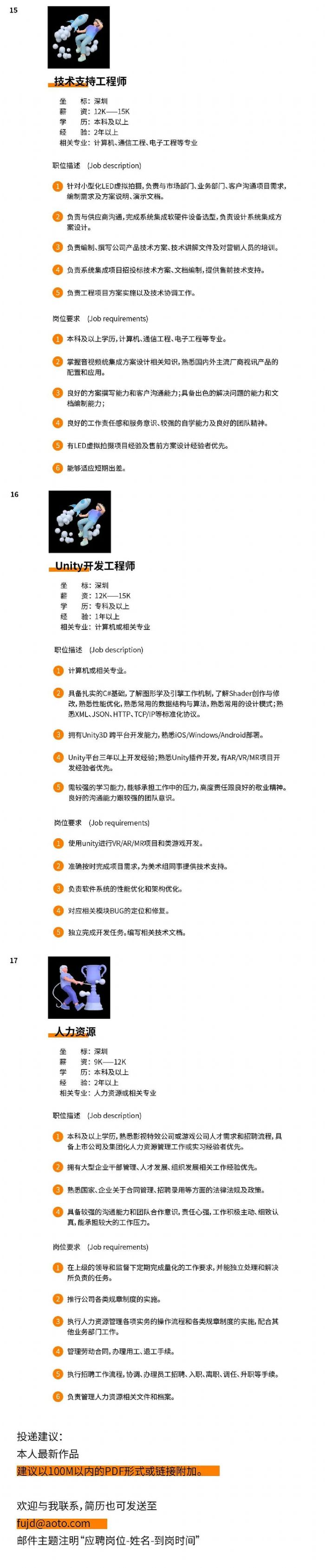 工作地點(diǎn)位于深圳市南山區(qū)榮超高新區(qū)聯(lián)合總部大廈。公司氛圍平等活躍,對(duì)職場PUA說達(dá)咩, 關(guān)懷員工身心健康,讓大家開心工作,釋放創(chuàng)意。實(shí)行每天八小時(shí)彈性制上班,員工可自行安排上班時(shí)間,雙休,五險(xiǎn)一金齊全。崗位要求詳情見下,有意向的朋友請(qǐng)將簡歷發(fā)送至 fujd@aoto.com  郵件主題注明“應(yīng)聘崗位-姓名-到崗時(shí)間”,建議以100M以內(nèi)的PDF或鏈接的形式附加本人最新作品。一起來搞事業(yè)吧!