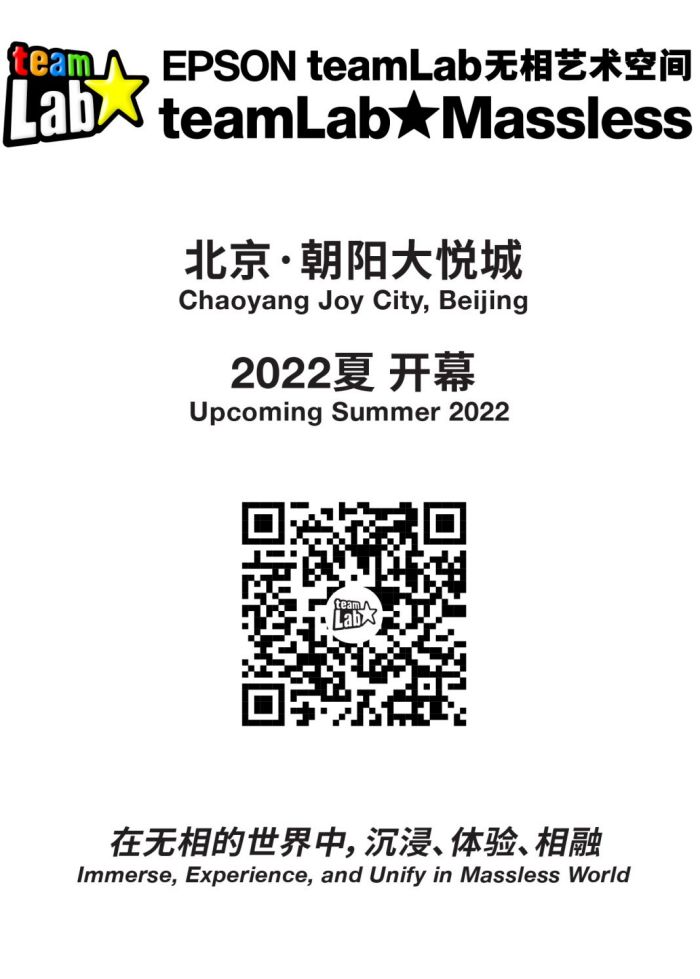 藝術團隊teamLab打造的大型沉浸式美術館“EPSON teamLab無相藝術空間: teamLab Massless Beijing”,將于2022年在北京開幕。teamLab基于“數(shù)字技術將人類的表達與體驗從物質中解放出來”這一理念,打造了不存在固定的表面的作品群,創(chuàng)造出以前所未有的沉浸感為特點的巨大空間。本次常設展位于北京朝陽大悅城最頂層,充分利用了展館10,000平方米的總面積與約11米的挑高。人們可以在這里將身體沉浸到作品中,用身體去認知,去探索一種沒有界線的連續(xù)性。