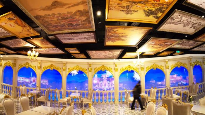 坐在沙發(fā)上小憩,可以仰望屋頂懸掛的眾多圓明園歷史名畫(huà),更精彩的是整面墻壁化身為觀(guān)景臺(tái),我們仿佛穿越時(shí)空,感受“光影大水法”的魅力。