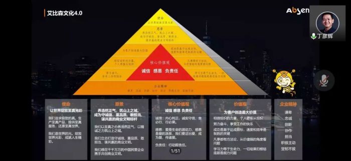 會議最后,艾比森董事長丁彥輝發(fā)表《慷慨正義、行穩(wěn)致遠》的主題演講,回顧了新冠疫情以來艾比森在國內(nèi)渠道建設(shè)、知識產(chǎn)權(quán)保護、人才培養(yǎng)與組織變革等方面的一系列關(guān)鍵舉措與成果。