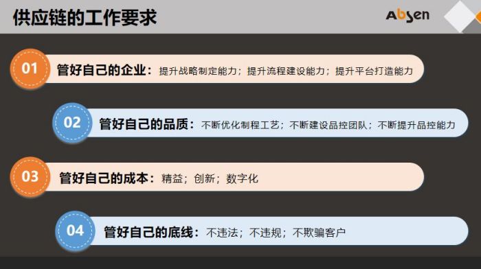 為促進“信息互通、要求傳遞、同頻共振”,艾比森副總裁趙凱在會上重點解讀了供應(yīng)鏈合作要求。趙凱認為,在交貨期越來越短、產(chǎn)品生命周期縮短、成本壓力增大、市場需求預(yù)測不準、競爭越來越激烈的市場環(huán)境下,供應(yīng)商伙伴應(yīng)從成本、質(zhì)量、交貨、柔性、速度、服務(wù)、創(chuàng)新等維度不斷提升能力。希望大家深刻理解并踐行艾比森“真”文化與“三不原則”,打造陽光廉潔的供應(yīng)鏈。