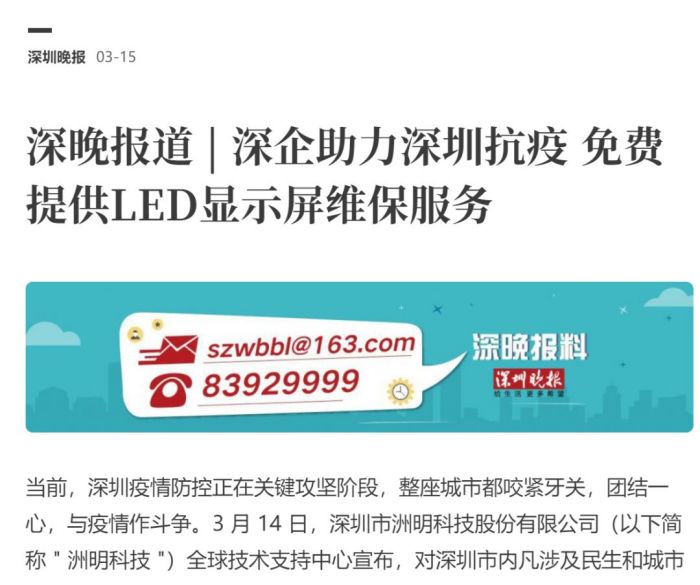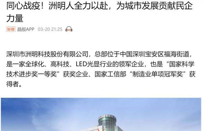 洲明科技為抗疫助力的行動(dòng),也得到深圳市工商聯(lián)及深圳晚報(bào)、晶報(bào)等媒體的肯定。