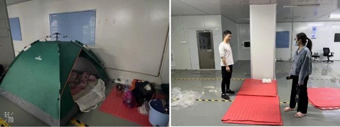 其中,一些駐守洲明坪山園區(qū)的同事,因?yàn)樗奚嵋呀?jīng)住滿,他們嚴(yán)格遵守防疫要求,哪怕打地鋪、睡帳篷,也要堅(jiān)守各自崗位,一心一意搞生產(chǎn)、做服務(wù)。