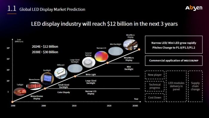 自20世紀(jì)80年代至今,LED顯示技術(shù)持續(xù)演進(jìn),市場(chǎng)規(guī)模日益壯大,行業(yè)生態(tài)漸趨成熟,應(yīng)用場(chǎng)景不斷豐富。目前,各大顯示及電視巨頭紛紛大舉投資Mini / MicroLED技術(shù),有望在未來5年內(nèi)引爆P1.0以下的微間距市場(chǎng)。