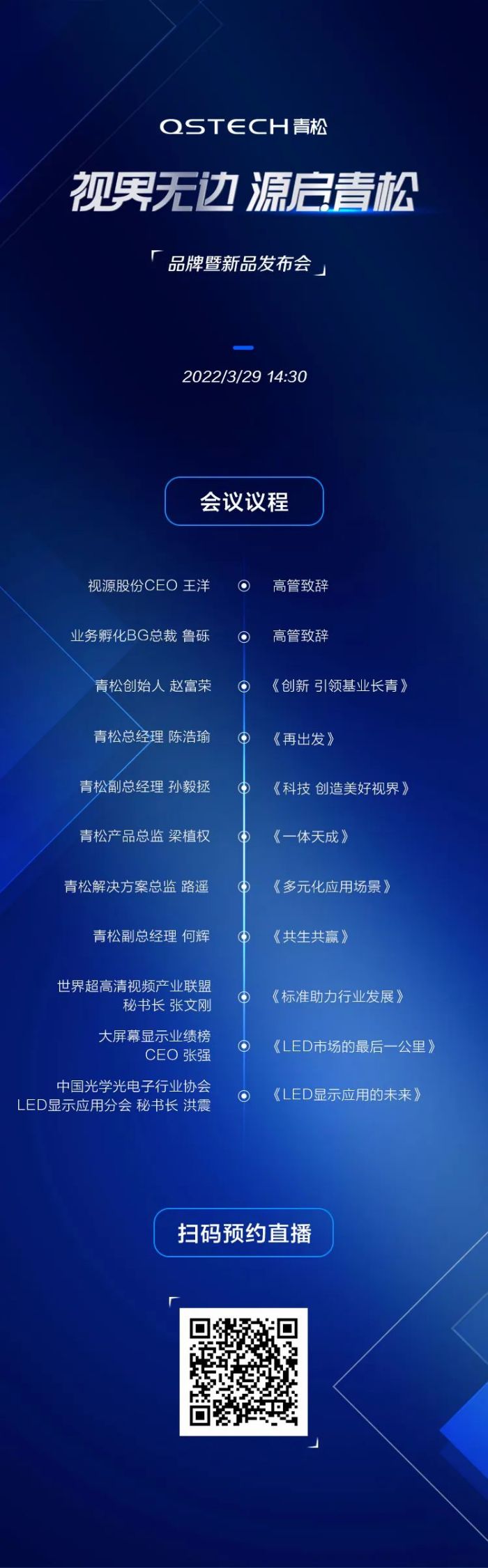 恰逢青松成立三十周年之際,QSTECH青松定于北京時間3月29日下午14:30,隆重召開 "視界無邊 • 源起青松” 青松光電品牌暨新品線上發(fā)布會。屆時,青松光電將推出系列 “一體化”、“節(jié)能環(huán)!、“便捷實用” 的LED顯示屏新品及不同應(yīng)用場景的多元化解決方案,分享品牌業(yè)務(wù)布局與戰(zhàn)略升級的新規(guī)劃,展現(xiàn)品牌建設(shè)及市場發(fā)展的信心與決心。