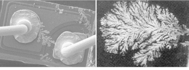 金屬遷移造成的失效現(xiàn)象大多存在于正裝芯片,主要因正裝芯片GAP間距小,一般為25~35微米,金屬離子容易溶解移動(dòng);啬咸斓乃秩胄酒笮纬呻娀瘜W(xué)腐蝕回路更加劇了金屬遷移的發(fā)生。