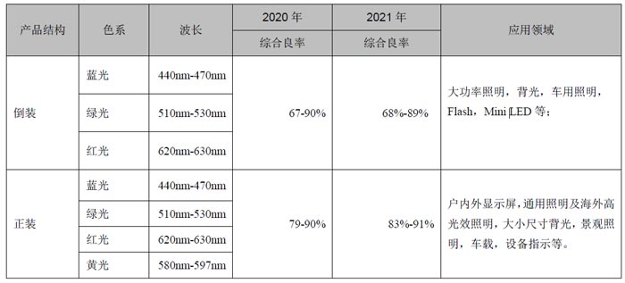 (3)LED芯片按色系區(qū)分,公司LED芯片主要產(chǎn)品及主要應(yīng)用領(lǐng)域如下: