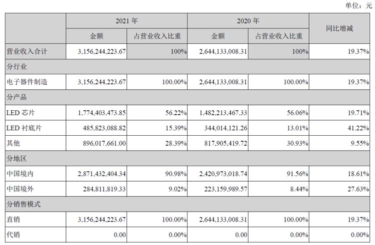 4月12日,華燦光電(300323)近日發(fā)布2021年度報告,報告期內(nèi)公司實現(xiàn)營業(yè)收入3,156,244,223.67元,同比增長19.37%;歸屬于上市公司股東的凈利潤93,623,596.06元,同比增長413.29%。報告期內(nèi)經(jīng)營活動產(chǎn)生的現(xiàn)金流量凈額為248,825,285.74元,截至2021年末歸屬于上市公司股東的凈資產(chǎn)6,427,597,960.83元。