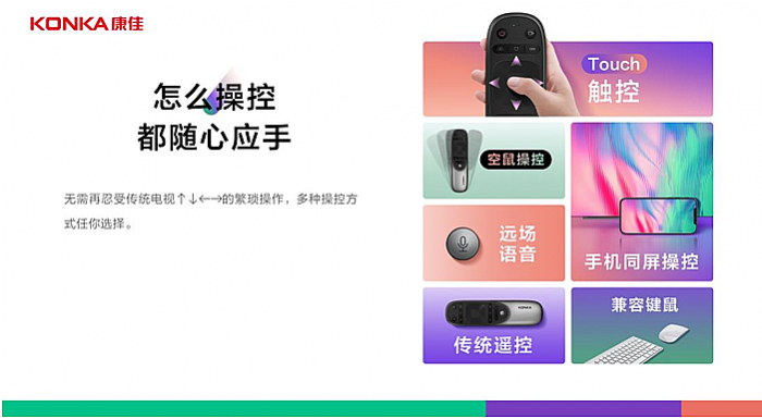 此外,康佳智慧場景屏APHAEA A6 Pro還帶來了全新操控方式,包括Touch觸控、空鼠操控、手機(jī)同屏操控、遠(yuǎn)場語音操控、傳統(tǒng)遙控等,同時還可兼容市面上大部分鍵鼠。遙控器內(nèi)置高精陀螺儀,輕晃一下頃刻化身智能飛鼠,光標(biāo)隨心應(yīng)手指哪打哪,擺脫傳統(tǒng)遙控器繁瑣操作,實現(xiàn)精準(zhǔn)操控?导阎腔蹐鼍捌罙PHAEA A6 Pro還能通過手機(jī)同屏鏡像操控電視,電視機(jī)頁面在手機(jī)上完全同步,手機(jī)點哪,電視就點哪,遠(yuǎn)程就能協(xié)助家人完成所有操控,給家人呈現(xiàn)想看的內(nèi)容。