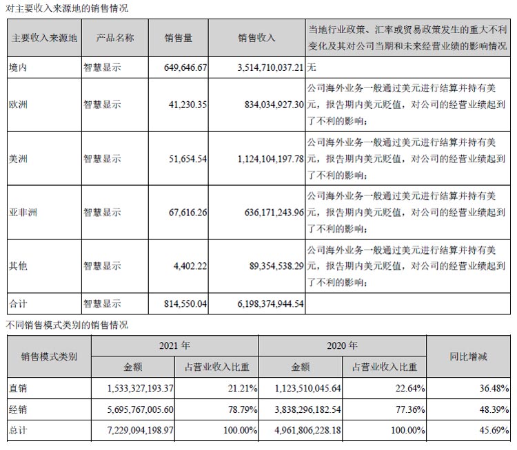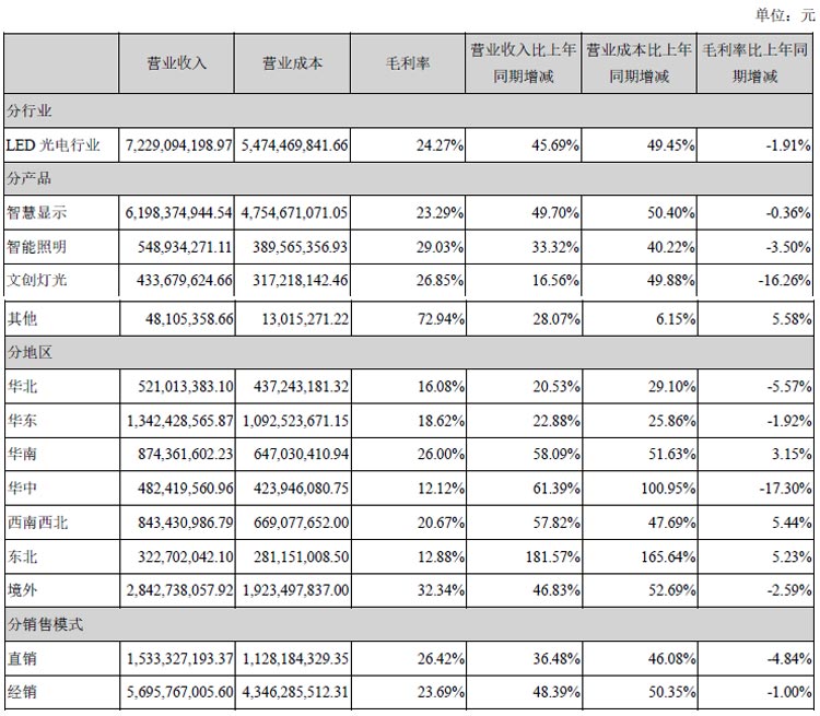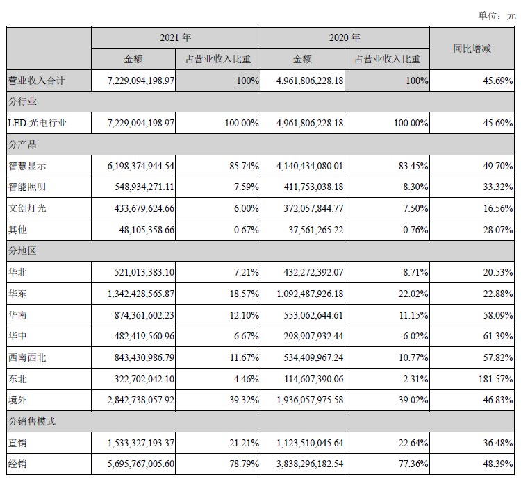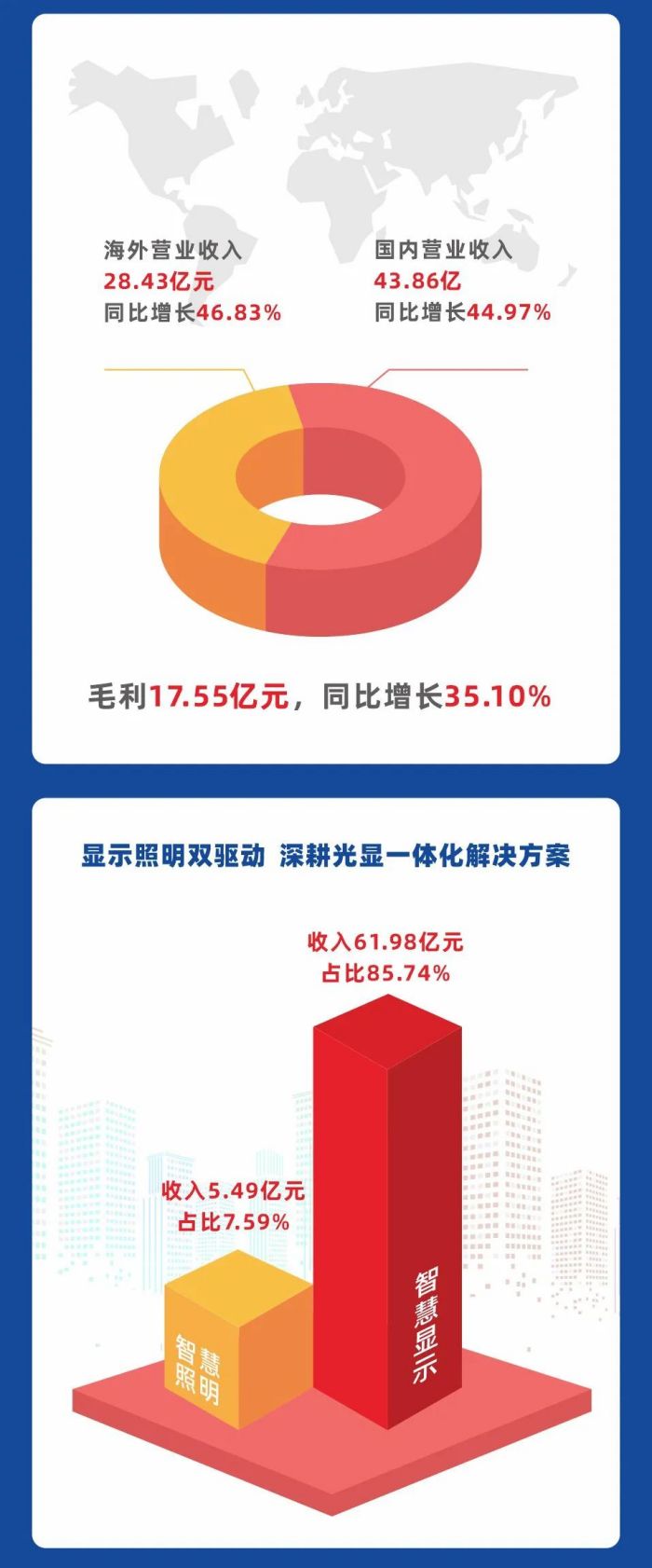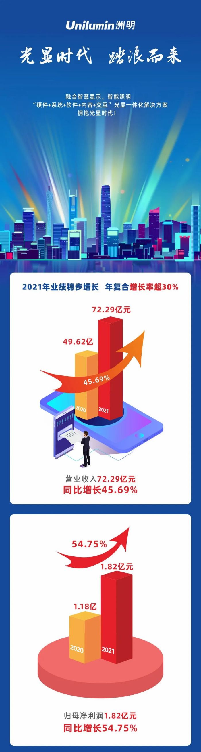 4月27日,洲明科技發(fā)布2021年度年報。報告期內(nèi),公司實現(xiàn)營業(yè)總收入72.29億元,較去年同期增長45.69%,其中海外營業(yè)收入28.43億元,較去年同期增長46.83%,國內(nèi)營業(yè)收入43.86億,較去年同期增長44.97%;實現(xiàn)歸屬于母公司所有者的凈利潤為1.82億元,較去年同期增長54.75%。