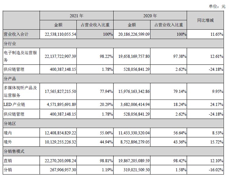 公司已完成“上游芯片、中游封裝、下游應(yīng)用”的LED全產(chǎn)業(yè)鏈深度布局,在LED通用照明、傳統(tǒng)LED背光、顯示領(lǐng)域已占據(jù)主要市場份額,并持續(xù)提升高端照明、Mini LED背光、Mini LED顯示等高端產(chǎn)品的占比。2021年全年實(shí)現(xiàn)營收45.72億元,同比增長24.17%,目前已成為公司第二增長曲線,并助力公司向“智慧顯示”升級。