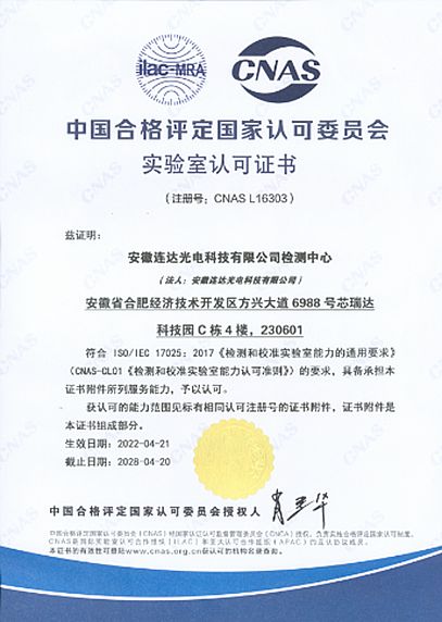 2022年4月21日,安徽芯瑞達科技股份有限公司全資子公司——安徽連達光電科技有限公司獲得CANS(中國合格評定國家認可委員會)頒發(fā)的實驗室認可證書(注冊號CANSL16303)。該實驗室位于安徽省合肥經濟技術開發(fā)區(qū)方興大道6988號芯瑞達科技園C棟4樓,經中國合格評定國家認可委員會認定(授權人:肖建華),符合ISO/IEC 17025:2017《檢測和校準實驗室能力的通用要求》(CAN-CL01《檢測和校準實驗室能力認可標準》)的要求,具備承擔所申報服務能力的要求。此次認可資格的取得,標志著安徽連達光電科技有限公司的檢測技術能力再一次贏得行業(yè)權威的認可,所出具的檢測數(shù)據具有國際權威性,數(shù)據國際互認。