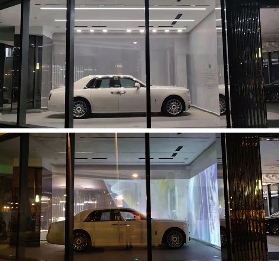 在勞斯萊斯汽車上!て治餍靺R濱江精品店的“快閃空間”中,采用升降紗幕搭配超短焦激光投影機(jī)疊加投影來(lái)實(shí)現(xiàn)!翱扉W空間”在營(yíng)業(yè)時(shí)是常規(guī)展位,但當(dāng)閉店后,展位中隱藏的紗幕降下,將其整個(gè)展位空間塑造為封閉式的展示櫥窗。投影機(jī)在紗幕上播放定制影片。櫥窗后配有感應(yīng)器,當(dāng)有行人在窗前駐足觀賞時(shí),投影畫(huà)面會(huì)消失,燈光打開(kāi),使勞斯萊斯汽車聚焦在燈光下,可謂精彩至極。