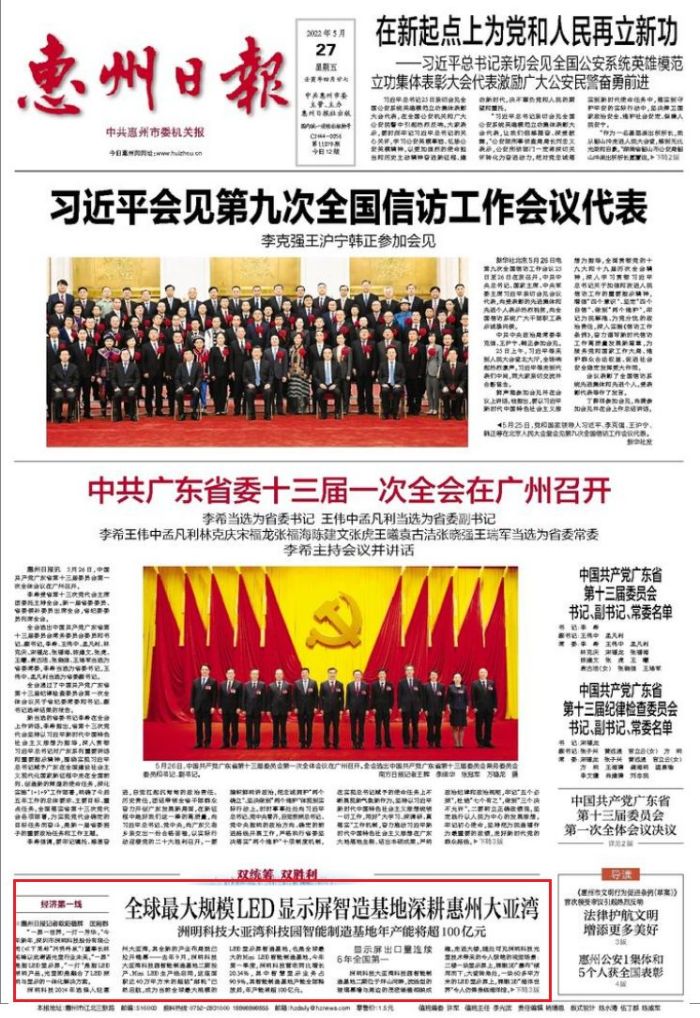 惠州日報頭版報道!全球最大規(guī)模LED顯示屏智造基地深耕惠州大亞灣