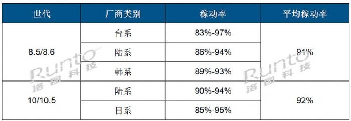 從去年底開始,全球液晶電視面板廠商持續(xù)以高稼動率運行。根據(jù)洛圖科技(RUNTO)數(shù)據(jù),今年第一季度,全球8.5/8.6代線的稼動率穩(wěn)定在91%左右,尤其在產(chǎn)能集中的大陸,除HKC在86%左右,廠商均在92%以上的高位。全球10/10.5代線的稼動率在92%左右,最高達到95%。