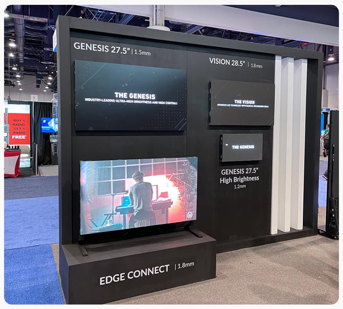 Micro LED魔鏡系列在展會上也受到非常多的客戶的關(guān)注。魔鏡系列采用COB板上芯片封裝技術(shù),對比傳統(tǒng)SMD封裝技術(shù),它的防護性、氣密性、散熱性能都得到了極大的提升,更適合微小間距Micro LED的封裝,再配合倒裝的封裝方式,實現(xiàn)屏體表面的高"黑"度、高亮度、高對比度,帶來逼真的顯示畫面和舒適的觀看體驗。