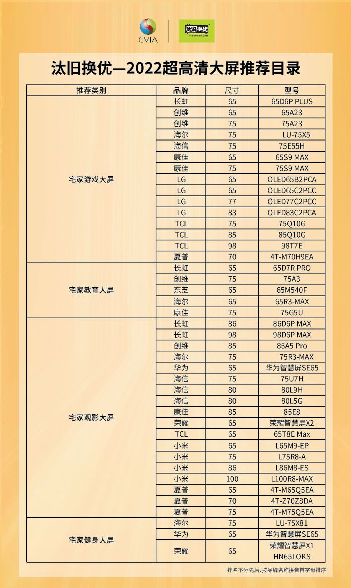 本次“汰舊換優(yōu)”推薦指南在618期間發(fā)布上線,吸引了長虹、創(chuàng)維、東芝、海爾、華為、海信、康佳、LG、榮耀、TCL、小米、夏普(排名不分先后)等全球知名消費電子廠商的踴躍參與。經(jīng)過企業(yè)申報和主辦方嚴格評審,共有“超高清觀影大屏”、“超高清游戲大屏”、“超高清健身大屏”、“超高清教育大屏”等四類41款新產(chǎn)品入選推薦指南。