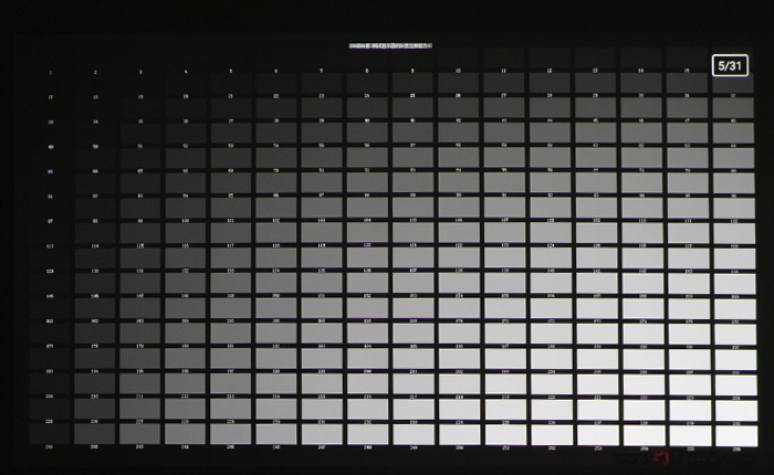 在色階方面,夏普XG-Q1A智能投影的表現(xiàn)雖然談不上非常優(yōu)秀,但也保持了應有的水準,投影畫面中比較顯著的色塊都能清晰分辨,黑位及白位部分存在極少色塊無法做到肉眼區(qū)分。同樣,在256位灰階測試中夏普XG-Q1A智能投影在黑位的表現(xiàn)上有6塊無法通過肉眼區(qū)分,白位方面也有著6塊無法通過肉眼區(qū)分(高端家用投影不可分辨灰階位總和一般在5~10位區(qū)間)。