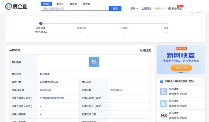 筆者從百度上查到,“極米堅(jiān)果”是江西彩影科技有限公司早2022年7月份申請(qǐng)的商標(biāo),申請(qǐng)/注冊(cè)號(hào)為65725020,目前正在審核中。