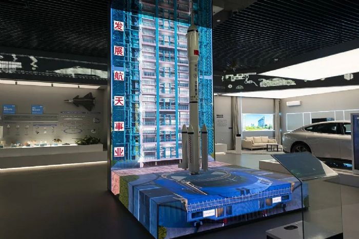 從汽燈紗罩、打火石到新能源汽車、航天科技,稀土在傳統(tǒng)、戰(zhàn)略新興、綠色低碳領(lǐng)域里都有不少成功的應(yīng)用。來到稀土與應(yīng)用區(qū)域,LED直角拼接屏真實地還原火箭升空場景,完美地詮釋了稀土與稀土產(chǎn)業(yè)助力中國航天事業(yè)發(fā)展的重要作用。