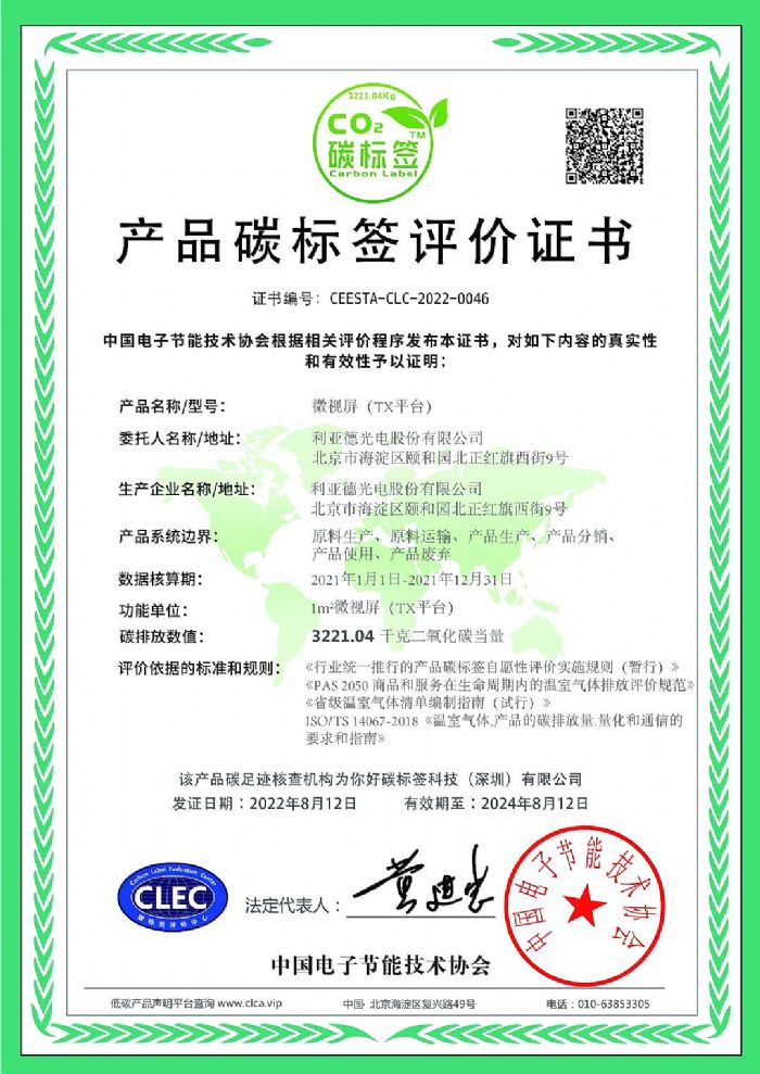 賦能雙碳目標(biāo) 利亞德獲行業(yè)首張產(chǎn)品碳標(biāo)簽評價證書