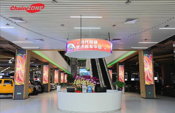 佛山青松在時代愛車小鎮(zhèn)的智慧顯示方案上標(biāo)新立異,為其度身定制的吊裝環(huán)形屏與柱形屏成為了場館內(nèi)的點(diǎn)睛之筆。