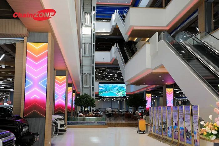 佛山青松運(yùn)用場館內(nèi)的布局特點(diǎn),以柱形屏營造出時尚的科技感。柱形屏通過高分辨率與高像素密度呈現(xiàn)高清的畫面,結(jié)合異步播放,遠(yuǎn)程控制,一鍵發(fā)布等功能,將“創(chuàng)意顯示+空間聯(lián)動”實(shí)現(xiàn)高度融合,達(dá)到整體氛圍統(tǒng)一的目的,襯托出汽車及其周邊產(chǎn)品高端、時尚的品質(zhì)感,助力搭建富有互動性的商業(yè)情景。