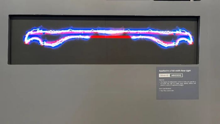 展品使用符合汽車安全完整性等級ASIL A的聚積驅(qū)動芯片MBI5353Q,模塊LED燈間距是0.9375mm,可獨立控制LED燈點的特性用于貫穿式尾燈,使得燈效更具變化而幫助車型的外觀設(shè)計越加豐富紛呈。