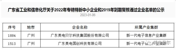 近日,廣東省工業(yè)和信息化廳公示了“2022專精特新中小企業(yè)和2019年到期復核通過企業(yè)名單”,廣東美電貝爾科技集團股份有限公司及旗下子公司廣東美電國創(chuàng)科技有限公司雙雙獲得“廣東省專精特新中小企業(yè)”認定,可喜可賀!