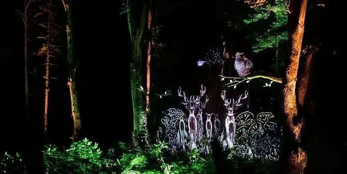 06:日本阿寒摩周?chē)?guó)立公園  公園通過(guò)全息投影技術(shù)、互動(dòng)裝置等,在樹(shù)林中將諸鳥(niǎo)類(lèi)和鹿之類(lèi)的動(dòng)物投影在森林之中,還原出原本充滿生機(jī)的森林的樣子。
