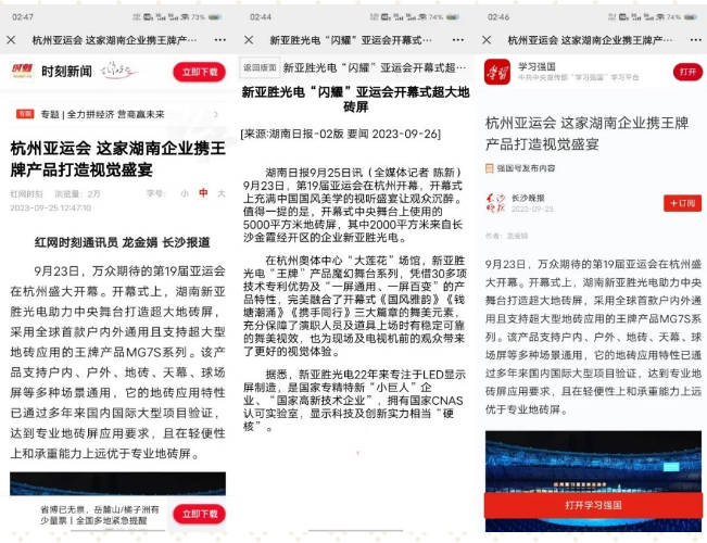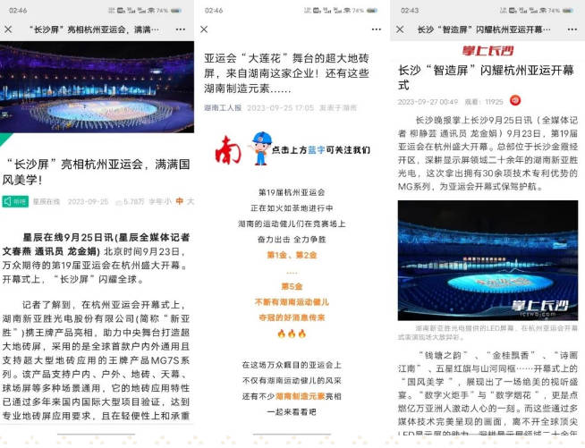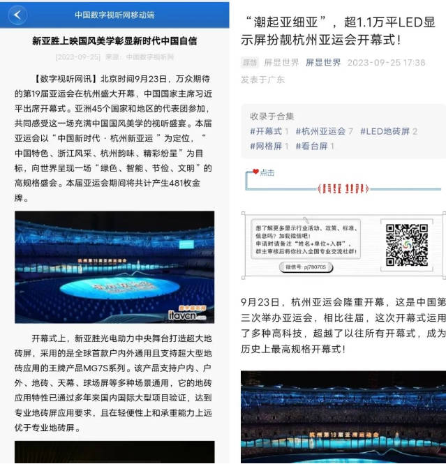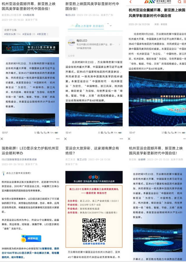 同時,新亞勝光電MG7S系列在杭州亞運會開幕式上的出彩表現(xiàn),也獲得了顯示屏行業(yè)媒體的一致認(rèn)可。CN視聽網(wǎng)、高工LED、每日LED、屏顯世界等紛紛在平臺發(fā)布相關(guān)宣傳文章,點贊新亞勝光電王牌產(chǎn)品MG7S系列!