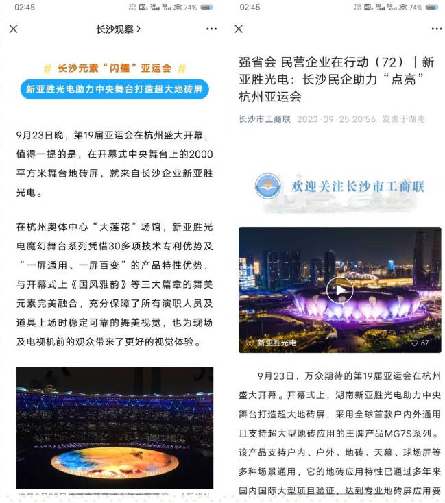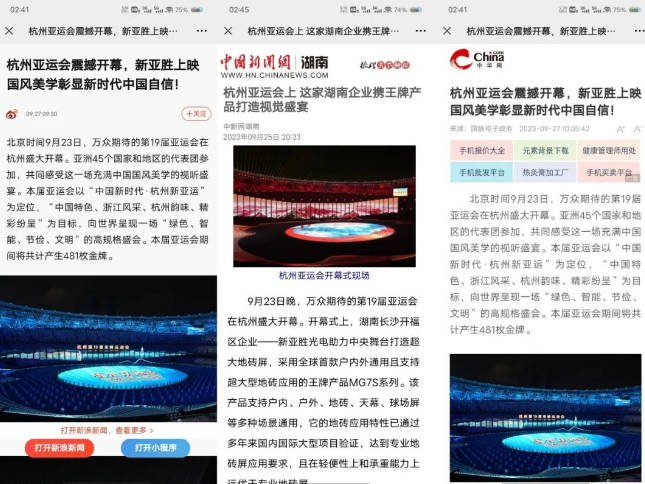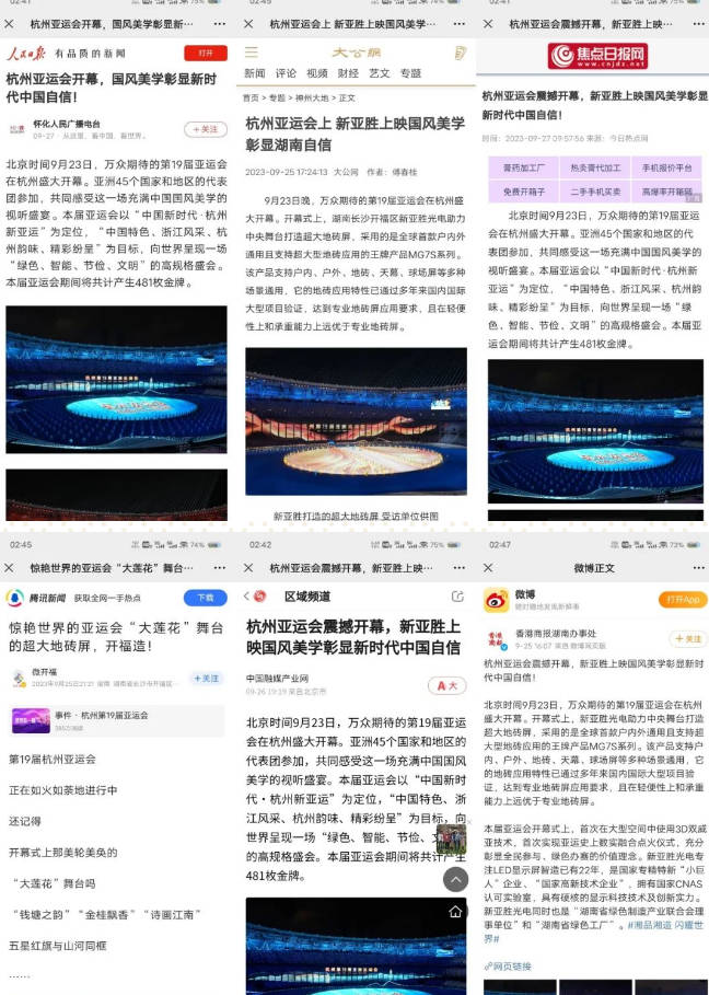 湖南省內(nèi)主流頻道通過新聞及專題全面跟蹤報道,截止10月4日,杭州亞運會開幕式的新亞勝光電地磚應(yīng)用相關(guān)報道,在包括湖南衛(wèi)視、湖南都市芒果TV、風(fēng)芒APP、湖南廣播電臺等融媒體總曝光量超2億次。