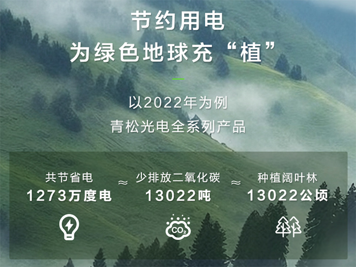 QSTECH青松光電是行業(yè)內(nèi)率先研發(fā)節(jié)能技術(shù)與產(chǎn)品的企業(yè)之一,于2023年推出了LED“碳”索計劃,建立碳足跡體系,持續(xù)深耕,推動開展技術(shù)研發(fā)、產(chǎn)品生產(chǎn)、場景應(yīng)用等減碳工作,打造“綠色全鏈路”。全系列產(chǎn)品一年可為業(yè)主節(jié)電1273萬度,相當(dāng)于為地球種下13022公頃闊葉林*。